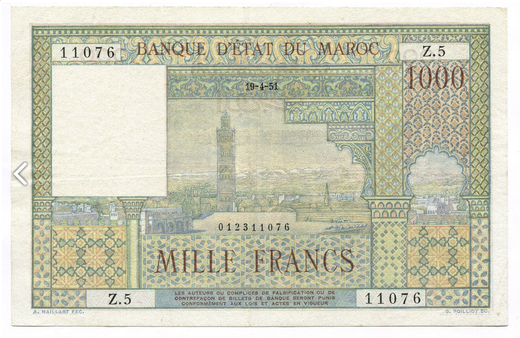 Maroc Billet de 1000 Francs – 19.04.1951 en Parfait état/TTB